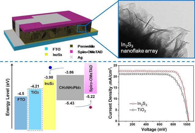 钙钛矿太阳能电池(PSCs)由于其能量转换效率高、成本低廉和制备工艺简单等优点,引起了科研工作者的广泛关注。电子传输层(ETL)作为钙钛矿太阳能电池的重要组件之一,可以选择性传输光生电子,抑制载流子复合,对电池能量转换效率的提高具有重要意义。针对目前传统ETL材料与钙钛矿层本征电子迁移率不匹配这一关键问题,该工作采用低温化学浴沉积方法制备了排列规整的In2S3纳米片阵列,并将其首次应用于钙钛矿太阳电池ETL的结构设计中。