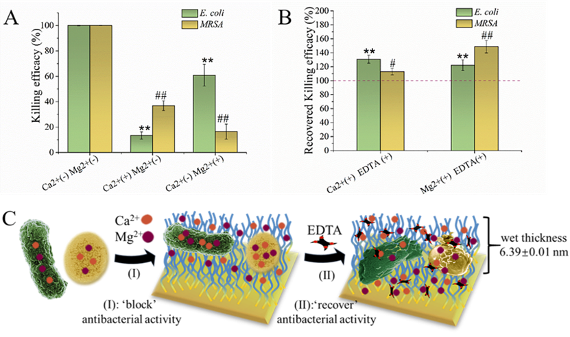 为了克服传统抗生素容易导致微生物产生耐药性的固有缺点,刘润辉教授近年来通过β多肽聚合物模拟天然宿主防御肽(Host Defense Peptide,HDP),寻找具有高效和广谱活性、且微生物难以产生耐药性的抗菌多肽聚合物。本研究首先证明了β抗菌多肽聚合物接枝到表面后仍然可以具有高效抗菌功能(包括对于耐药细菌MRSA);同时发现,所研究的β多肽聚合物未出现溶血和细胞毒性,且支持哺乳动物细胞在修饰表面的粘附和快速生长;通过进一步细致研究,还揭示了β多肽聚合物修饰表面通过置换/夺取细菌细胞膜上起到稳定细胞膜重要功能的二价Ca2+、Mg2+,获得抗菌功能的机理。