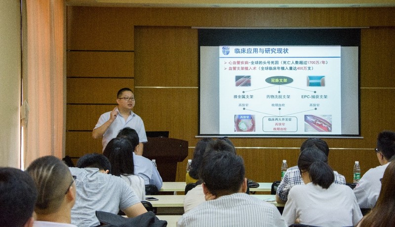 报告中,杨教授介绍了他们团队构建基于一氧化氮(NO)催化释放支架治疗心血管疾病方向的研究工作。由于NO具有抑制血小板粘附/激活、抑制平滑肌细胞增殖、调节炎症反应、预防动脉粥样硬化发生及促进受损内皮组织修复等多重生理功能。杨教授团队通过构建可NO催化释放支架,实现了仿生天然内皮细胞层长期、稳定、持续释放NO功能,很好解决了目前临床使用支架导致的血栓及血管再狭窄等问题,以期有效降低支架临床并发症的发生。
