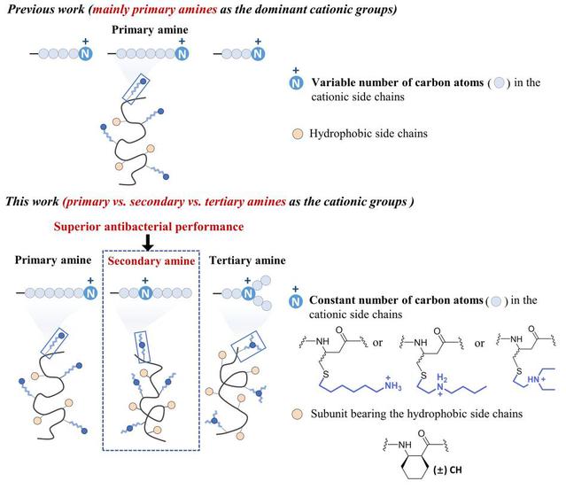 宿主防御肽的抗菌活性关键来源于多肽序列中的阳离子氨基酸,如赖氨酸和精氨酸。因此目前宿主防御肽模拟聚合物的结构设计中通过引入赖氨酸的伯胺结构或精氨酸的胍基结构以获得有效抗菌的阳离子聚合物。本研究发现,仲胺可以作为一类阳离子用于模拟宿主防御肽的结构设计,并以此获得具有高效抗菌活性的抗菌多肽聚合物。这一结构设计新思路对今后模拟宿主防御肽结构设计具有指导意义。