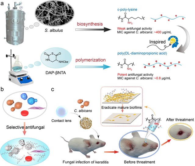 侵袭性真菌感染造成全球每年约150万人死亡,尤其在免疫抑制人群中更是常见。但临床使用的抗真菌药物种类少,并且伴随着功效差、毒副作用大等问题。更令人担忧的是,长期反复使用抗真菌药物造成了严重的真菌耐药性问题,影响人类对真菌感染的有效控制。因此亟需研究寻找抗真菌活性高、安全性好、不易产生耐药性的抗真菌剂来应对真菌感染的严重问题。ε-聚赖氨酸具有高效的抗细菌活性,但抗真菌活性较弱。作者推测其原因是真菌细胞膜相对于细菌具有更低的负电荷密度,造成ε-聚赖氨酸与真菌细胞膜的相互作用较弱,抗真菌活性不佳。作者提出通过提高ε-聚赖氨酸的正电荷密度来设计抗真菌聚合物,设计并基于本课题组近期建立的水分耐受的β-NTA聚合制备β-多肽合成方法(Angew. Chem. Int. Ed.2020, 59(18), 7240)制备了高正电荷密度的β-多肽聚合物,聚(DL-二氨基丙酸)(PDAP)。研究表明PDAP具有强效的抗真菌活性,忽略不计的溶血毒性和细胞毒性,能够有效清除真菌成熟生物被膜,且不易使真菌产生耐药性。作者深入研究了PDAP的抗真菌机理,并报道了其优异的体内安全性和有效治疗真菌角膜炎感染的效果,展示了PDAP在抗真菌领域具有广阔的应用前景。