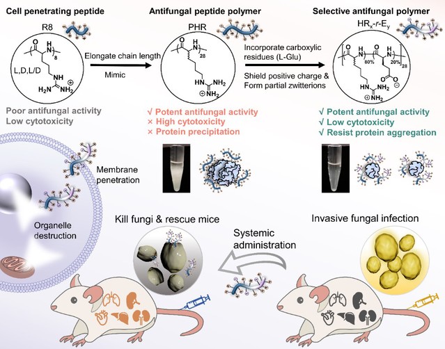 本研究中,刘润辉教授研究团队受细胞穿透肽八聚精氨酸启发,发现D,L-高聚精氨酸与L-谷氨酸的长链长多肽共聚物(27~28 mer)具有高效抗耐药真菌功能,且引入特定比例的L-谷氨酸有效降低了多肽聚合物的细胞毒性,减少了多肽聚合物与血浆蛋白的相互作用以避免蛋白聚集/沉淀。优选多肽聚合物能够有效穿透真菌细胞膜、破坏真菌细胞器完整性从而杀死真菌,并在体内表现出高效的抗侵袭性耐药真菌感染治疗效果以及良好的体内生物相容性与安全性,为设计新型低副作用、高效选择性抗真菌化合物以对抗侵袭性耐药真菌感染提供了一种新策略。