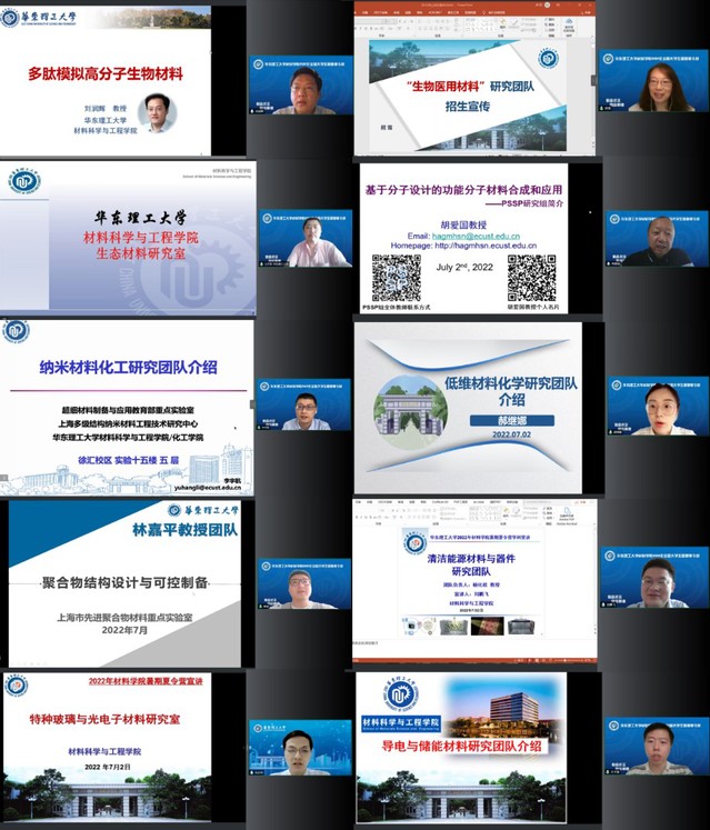 开幕式结束后,在王立权的主持下,生物材料研究团队屈雪教授、材料研究所所长胡爱国教授、生态材料研究室汪济奎教授、蛋白/多肽功能模拟高分子研究课题组刘润辉教授、纳米材料化工团队李宇航副教授、低维材料化学研究团队郝继娜特聘副研究员、新能源材料与器件研究团队刘鹏飞特聘副研究员、聚合物结构设计与可控制备团队高梁特聘副研究员、导电与储能材料研究团队王文强博士、特种玻璃与光电子材料研究团队朱正举博士分别围绕团队科研方向、师资力量、学术成果、人才培养、就业情况等方面开展了深入浅出、形象生动的学科介绍。介绍结束之后,老师和营员们进行了深度交流,营员们就关注的问题积极发问,讨论气氛热烈。