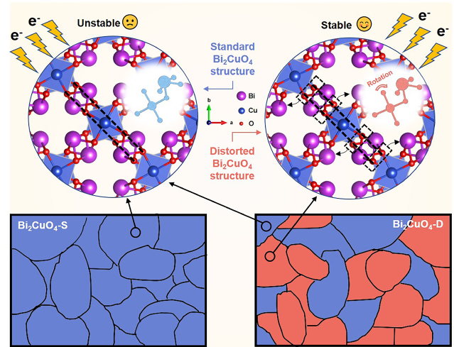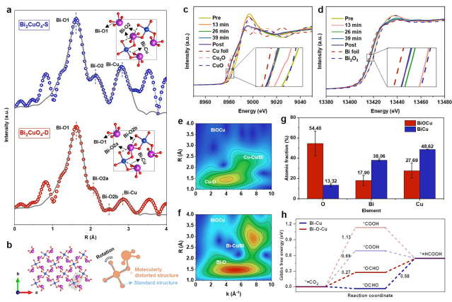 针对这一问题,研究团队报道了一种存在分子级结构畸变的廉价金属氧化物Bi2CuO4,可用于高效CO2电合成制甲酸盐过程。结合X射线吸收精细结构谱和理论计算解析了Bi2CuO4催化剂的局域结构,阐明了Bi2CuO4中存在的畸变是[CuO4]6–单元在其平面内发生旋转导致的;借助Operando X射线吸收谱在线检测了CO2RR过程中金属位点的价态及其配位环境的变化,并结合能量色散X射线谱结果证实了结构畸变有利于反应过程中晶格氧的保留。进一步通过理论计算探究了催化剂在CO2RR过程中残留晶格氧的作用,证明晶格氧的存在可以优化甲酸中间体的吸附能,最终提升了催化剂的CO2RR性能。该工作通过分子级局域结构调控实现了甲酸盐电合成性能的大幅提升,对于构建高效、稳定的电催化剂及其他相关能源催化领域材料提供了新的研究思路。
