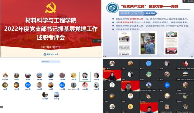 述职考评会分教工党支部书记和学生党支部书记两场次进行。25位党支部书记分别从党支部概况、基层党建、疫情防控、支部品牌活动等方面回顾了2022年党支部工作开展情况,并逐一介绍优秀共产党员推荐对象事迹。教工党支部书记就如何以党建引领、校企共建等推动育人、科研、教学等各项工作,助力疫情防控,发挥党支部服务功能等方面进行了展示交流。学生党支部书记聚焦如何创新“三会一课”开展模式,契合学生党员实际需求,以党建引领科研学习、助力疫情防控等分享了做法。本次考评会为师生党支部交流互鉴,锻长板、补短板提供了“可视化”的学习平台。