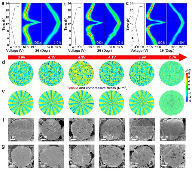 江浩/李春忠课题组实施原位共沉淀策略以获得新型超分散Nb掺杂的高镍正极材料,该正极材料由细长和径向排列的初级粒子紧密堆积组成,富有更强氧稳定性的(001)平面。其独特的微观结构使晶内和晶间应变分布均匀,球形二次粒子稳定,有效抑制了微裂纹的形成,扩展及表面退化。同时,超分散的Nb掺杂有效防止了Li/Ni的无序化和晶格氧逸出,从而进一步增强了正极材料的晶体结构和热稳定性。这些优势使其在各种速率和工作温度下表现出卓越的电化学性能,并在软包全电池中具有出色的循环寿命。因此,该正极材料在0.1C下具有229.0 mAh g-1的高可逆比容量。在软包全电池中,在3.0-4.2 V范围内,在1C条件下500次循环后容量保持率为91.9%,5C条件下2000次循环后容量保持率为80.5%,表现出超长寿命,满足电动汽车的轻量化和智能化的需求。