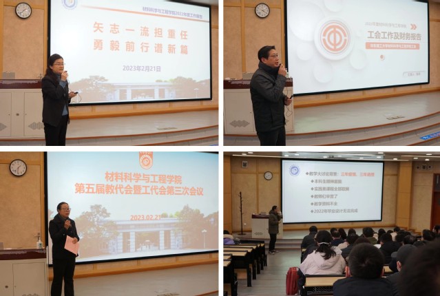 学院党委书记袁媛代表党政班子作“矢志一流担重任 勇毅前行谱新篇”工作报告、财务报告。从党建工作、学科建设、科学研究、师资队伍、教育教学、安全工作、先进材料大楼、疫情防控、校庆工作等方面回顾了2022年学院工作开展情况和取得的成果,重点分析了学院发展目前面临的机遇和挑战。她指出,2023年是贯彻党的二十大精神的开局之年,要以学校“双一流”建设为目标,主动融入中国式现代化大局,结合“十四五”规划和学校、学院发展实际,进一步凝练学科方向和特色,强化基地平台建设,推进先进医用材料与器械全国重点实验室,工程硕士/工程博士,有组织的科研,先进材料大楼建设,推进学院高质量发展。