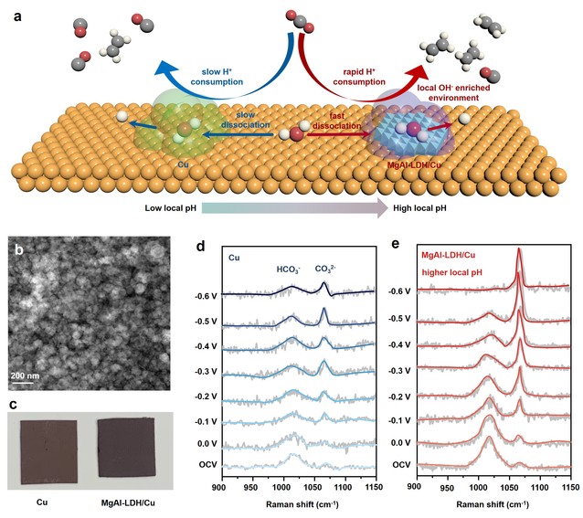 针对这一关键问题,研究团队通过在铜电极表面引入低成本的单层层状双金属氢氧化物(LDH)无机改性剂,构建了稳定的MgAl-LDH/Cu界面结构,促进反应过程中水解离生成OH-离子,用于调节中性电解质中Cu电极表面的局域pH值,并将其应用于高效乙烯(C2H4)电合成过程。所构建的MgAl-LDH/Cu电极在1.0 M KHCO3中表现出性能优异的CO2到C2H4转化活性,在300 mA cm-2电流密度下C2H4产物法拉第效率为55.1%。原位光谱和理论计算表明,在外加电位作用下,MgAl-LDH促进了H2O的快速解离并提供了高浓度的OH-离子,修饰后的催化电极界面在中性溶液中具有高于Cu电极表面的局域pH值。该工作证明了无机改性剂在调节局域化学反应环境的可行性,为其他小分子电化学转化领域高性能、低成本催化电极材料的理性设计提供了新的研究思路。