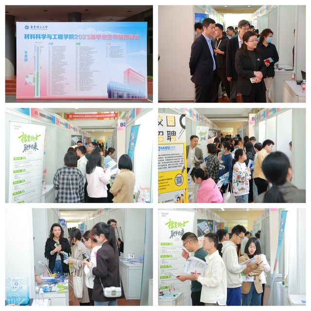 在徐汇校区八教一楼举办春风送暖,“职”等你来材料专场招聘会。党委学生工作部(处)副部(处)长郑东、学院党委书记袁媛、学院党委副书记兼纪委书记苏建玲、学院党委副书记戴诚安、党委学生工作部(处)周全华、党委学生工作部(处)毛旭辉及学院教师来到现场指导工作,并与用人单位、求职学生深入交流。