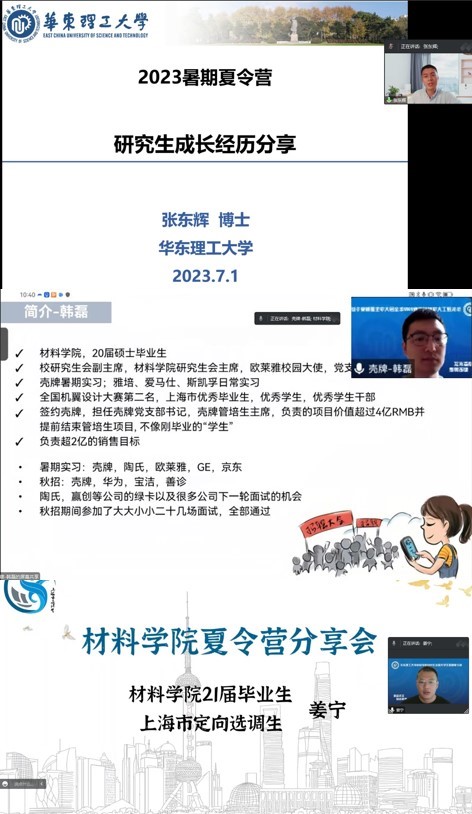 奉贤校区学生,以线上线下相结合的方式,开展招生宣讲。研究生招生负责人陈亚琴对同学们普遍关心的招生政策进行了详细解读,并现场回答同学们的各种提问。随后,进入到专家讲座环节。生物材料研究团队屈雪教授,聚合物结构设计与可控制备团队特聘副研究员高梁,低维材料化学研究团队牛德超教授,新能源材料与器件团队刘鹏飞副教授,生态材料研究室汪济奎教授,导电与储能材料研究团队王文强博士,特种玻璃与光电子材料研究团队朱正举博士,纳米材料化工团队张玲研究员,蛋白/多肽功能模拟高分子研究课题组刘润辉教授,生物降解高分子材料团队肖艳副教授,基于分子设计的高能分子材料合成和应用团队胡爱国教授分别围绕团队研究方向、导师队伍、学术成果、学生培养、就业情况等展开了深入浅出、风趣幽默的报告。不同团队的多样化研究给营员们带来高质量的思想碰撞与学术交流。