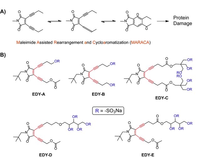 烯二炔是由一个烯单元共轭连接两个炔单元而形成的“炔-烯-炔”主体化学结构。由于它们结合了独特的分子结构和强烈的生物大分子(如DNA)剪切活性,吸引了无数合成化学家和生物学家的目光。天然烯二炔是目前已知最具细胞毒性的分子,它们的抗肿瘤活性比临床上常用药物如阿霉素高出上千倍。除了剪切DNA外,烯二炔类化合物还可作用于蛋白质,使蛋白质链发生分子内交联或降解,从而失去其结构完整性乃至生物活性。然而,天然烯二炔是从放线菌中分离得到的,来源非常稀少,提取量一般在微克级别。由于它们复杂的分子结构,通过化学方法进行合成也非常困难,极大地限制了它们的应用。为了寻找能够替代天然烯二炔的优异药物,人们付出了大量努力用于设计合成具有高反应活性的烯二炔分子。经过系列研究,发现在非环烯二炔的烯端引入马来酰亚胺基团对于降低化合物的热触发反应温度有着重要作用,并提出了马来酰亚胺促进的重排和环芳香化反应(MARACA)机制()。研究表明马来酰亚胺基团的存在可以促进分子内的级联1,3-质子转移过程,使得原本热稳定的开环烯二炔化合物在生理环境下原位转化为烯炔-联烯结构,并快速通过Myers-Saito环化反应形成高活性的双自由基中间体。