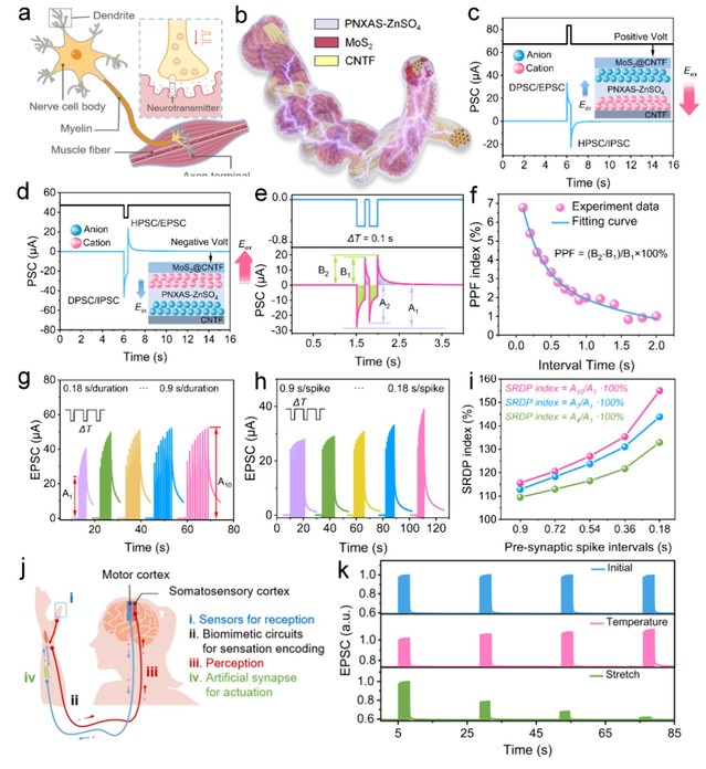 离子导电水凝胶具有类组织柔软度、丰富的含水量、离子导电性和生物相容性,在软机器人、可穿戴电子和生物电子工程中具有广阔的应用前景。然而,由于界面不兼容、机械性能差、能量消耗大、感知能力有限等缺点,基于离子导电水凝胶的仿生突触器件(如类人皮肤)在实际应用中受到各种各样的限制。