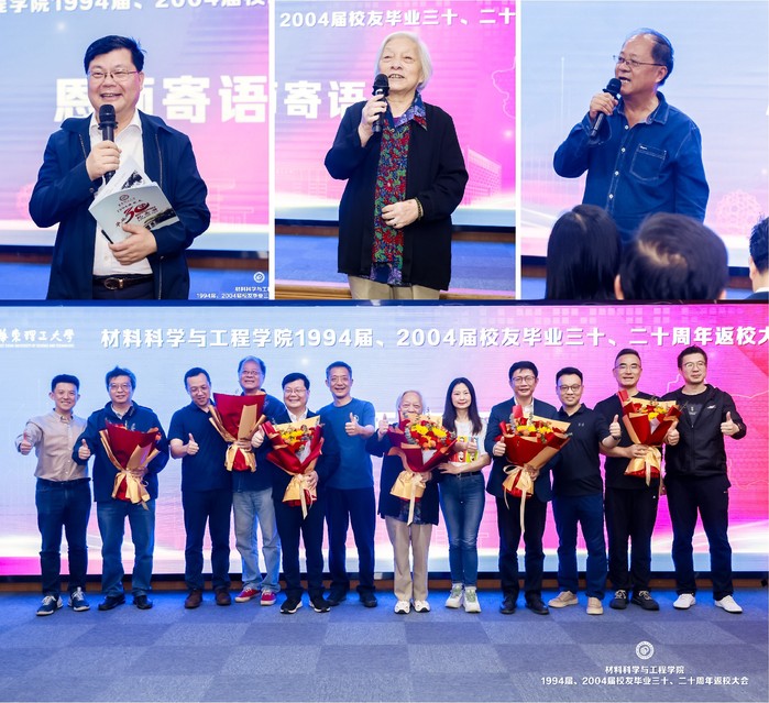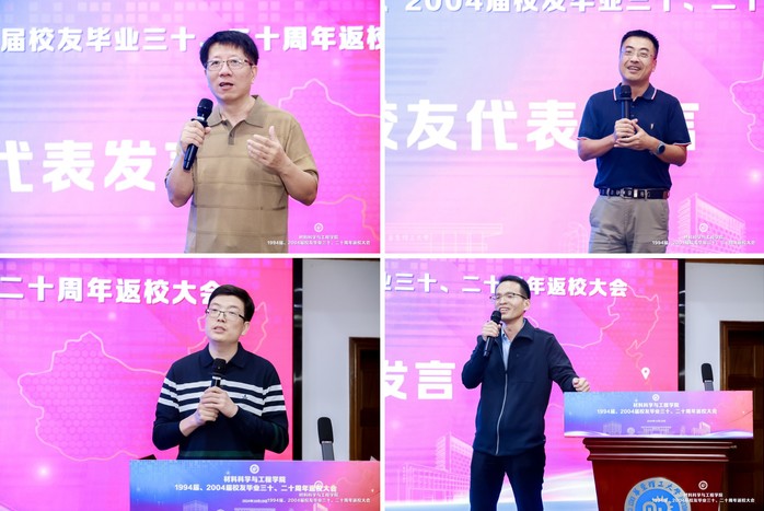 在校友代表发言环节,高材902班、上海汽车股份乘用车分公司韩伟民对学校、学院组织返校活动表示感谢,让毕业多年的老同学有了再次“相识”的机会,为校友们建立起一个新的“朋友圈”,搭建了互相帮扶、资源共享的平台。无材902班、中讯网络科技有限公司沈凯感谢母校培养了他们面对问题、解决问题的能力,为毕业后在不同领域发展打下结实的基础,倡议各位校友在各自领域继续奋斗,为母校争光。高材002班、华昌聚合物有限公司杨萌回顾了在华理校园的青葱岁月和美好记忆,表示今后与各位校友要继续弘扬校训精神,加强沟通联系,积极关注母校发展,立足本职工作,勇担社会责任,为提升母校的社会影响力贡献力量。无材002班、从美国漂洋过海回校的陈益凯讲述了在华理的求学故事和毕业后的工作经历,他感恩在母校学到了扎实的专业知识,对目前从事的工作有着深刻影响,祝愿母校能培养出更多高层次人才。