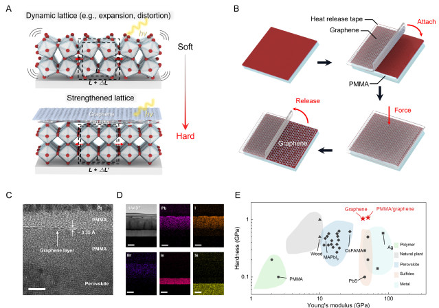 石墨烯具有超高模量(约1 TPa),是钙钛矿材料模量的50~100倍,且具有均匀致密、耐机械疲劳和化学稳定的优点。有没有可能借用石墨烯这个“外援”,来提升钙钛矿的稳定性呢?然而,石墨烯与钙钛矿并不兼容,如何实现是一大难题。