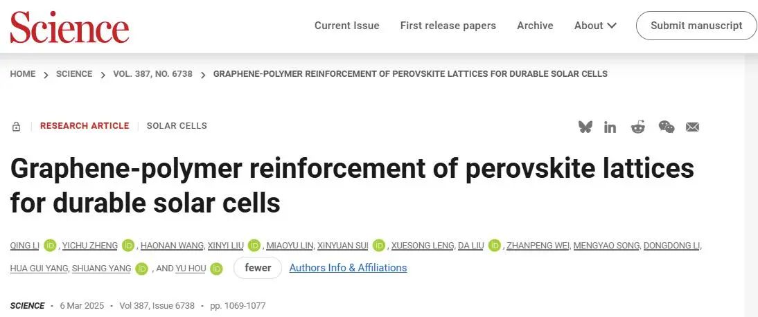 清洁能源材料与器件团队侯宇教授、杨双教授等人在Science(《科学》)发表题为“Graphene-polymer reinforcement of perovskite lattices for durable solar cells”的最新研究成果。该研究发现了钙钛矿光伏不稳定性的关键机制——光机械诱导分解效应,提出石墨烯-聚合物机械增强钙钛矿材料的新方法,制备的太阳能电池器件在标准太阳光照及高温下的T97工作寿命创下3670小时新纪录,该研究成果将为钙钛矿太阳电池的产业化应用提供全新解决方案。