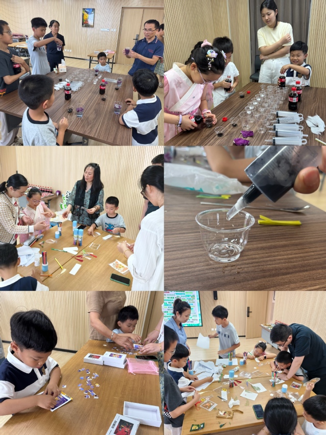 在特色活动环节,材料实验教学中心陈健壮老师带领孩子们动手体验了“甘蓝苏打变色”“可乐变清水”等趣味科学实验,不仅讲解了“酸碱指示剂”“活性炭吸附”等科学原理,更引导孩子们从直观的实验现象中感受“清廉如水,污浊如腐”的寓意。随后的手工环节中,孩子们结合廉洁名言警句,发挥创意,用彩笔在空白书签上精心绘制图案、书写警句,将清正廉洁的理念悄然融入日常阅读中。拼图游戏环节则通过趣味PK互动展开,一幅幅生动的廉洁动画形象逐渐完整呈现,孩子们在动手动脑间加深了对廉洁价值观的感悟,活动现场气氛热烈。