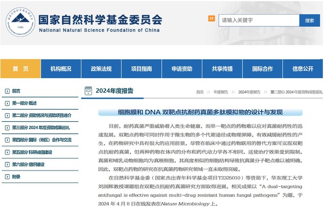 刘润辉教授课题组在双靶点抗耐药真菌领域取得突破性成果入选国家自然科学基金委2024年度报告“2024年度资助成果巡礼”()。